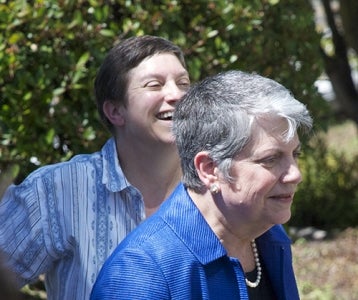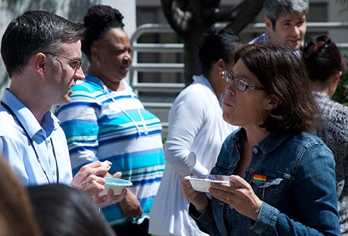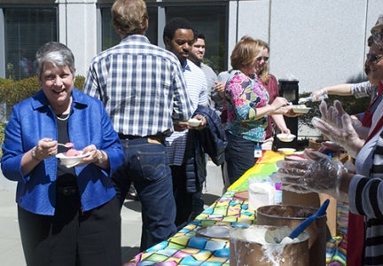 Introduced by UCOP Pride leader Karin Rice as “always supportive” of LGBTQ staff, President Napolitano praised the rich diversity at UCOP and noted that UC campuses are considered among the most LGBTQ-friendly in the country. She also announced recent developments to help students, including voluntary identification as LGBTQ on UC applications, so that we have the data needed to allocate resources for them. Moving forward, new campus buildings will need to have gender-neutral restrooms and changing rooms, she added. After closing her brief remarks with “Let’s enjoy the ice cream before it melts!” she joined the rest of the staff for a cooling scoop.