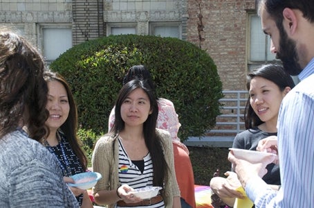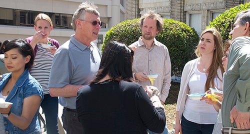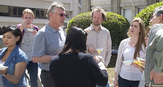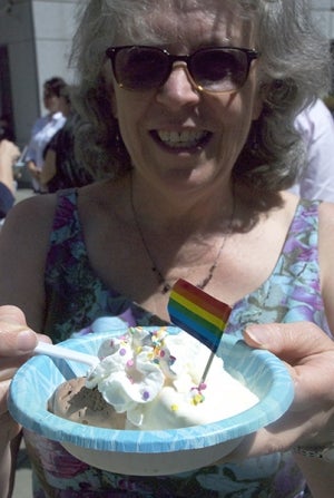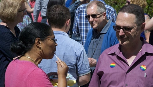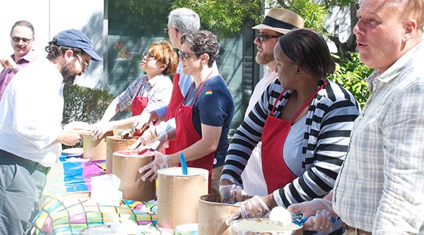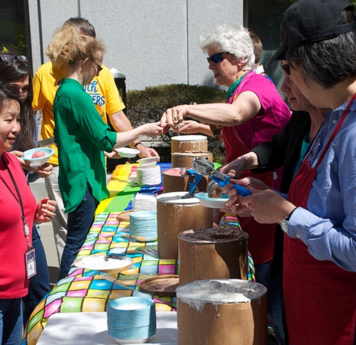 With the thermometer hitting 85 degrees in Oakland, the annual UCOP Pride Ice Cream Social could not have been more welcome. An enthusiastic crowd of 150 employees jammed the fifth floor roof garden of the Franklin building, enjoying not just the cool treats but the community of co-workers. Under fluttering rainbow flags, members of UCOP Pride set records for speed scooping to make sure everyone in a long line got their bowl filled before the heat could do its worst.
