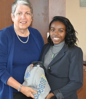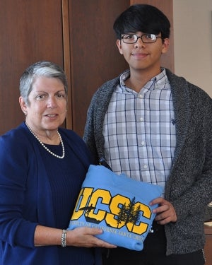 On Friday, Aug. 5, President Napolitano celebrated this year’s five recipients at a special lunch also attended by UC staff and community leaders involved in the program, as well as family members. After receiving congratulations on their achievements, the scholars were asked to share their concerns, which included the usual fear of academic rigor. President Napolitano sympathized, talking about the shock of finding out that what had been “A” work in high school didn’t pass muster in college, but she also reassured them that the university is “an environment of opportunity and challenge — and fun.” Confessing that she didn’t settle on a major until late in her college career, she encouraged them to explore and experiment in their studies because “you might find a new passion.”