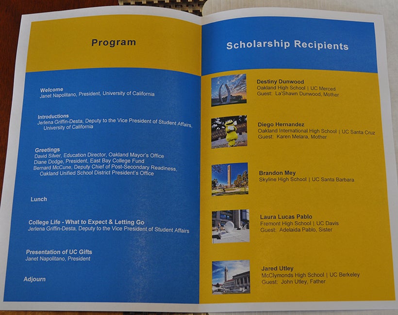It’s with those needs in mind that the President’s Scholarship was created in partnership with the East Bay College Fund (EBCF). The program bestows a four-year award worth a total of $16,000 (distributed each quarter/semester) to a select group of Oakland high school seniors who will be attending UC. To ensure the students’ success, EBCF incorporates all recipients into its mentorship program (which UCOP staff is invited to participate in).