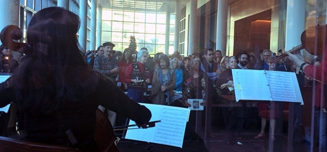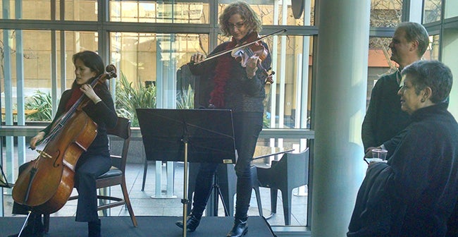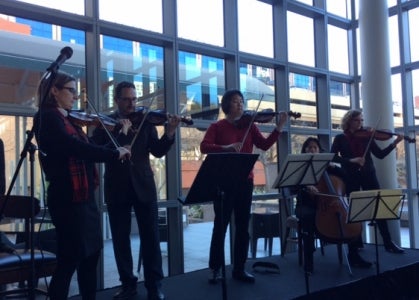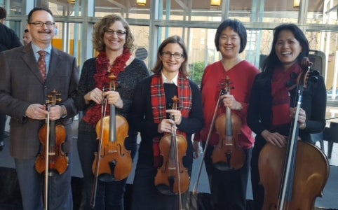 Making their performance debut, the UCOP String Quintet showed that old favorites like “Frosty the Snowman” and “Let It Snow” sound utterly elegant when played on violin and cello. And their rendition of “Winter Wonderland” was so catchy that Lloyd, President Napolitano and CFO Nathan Bostrom couldn’t help but sing along.