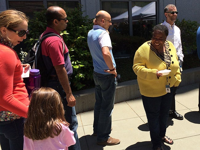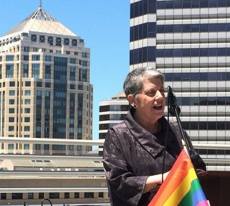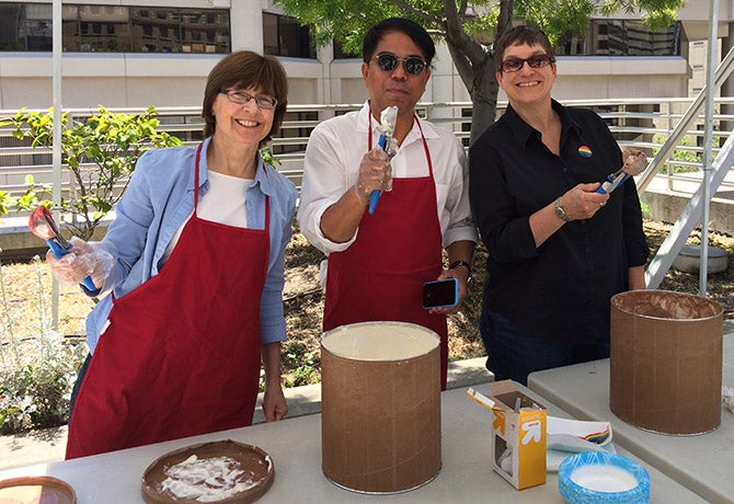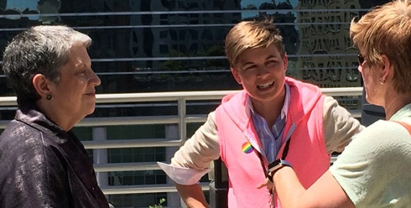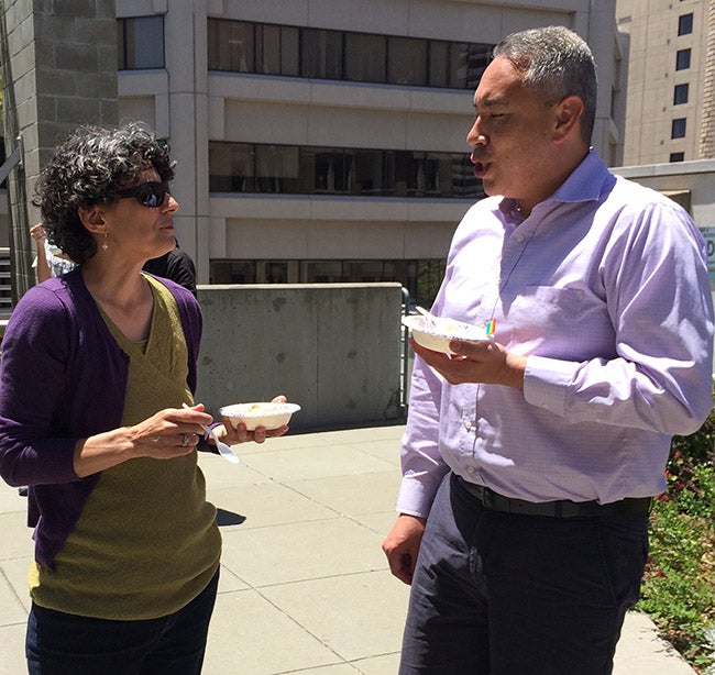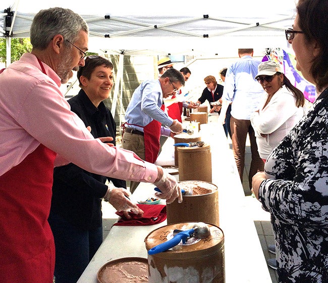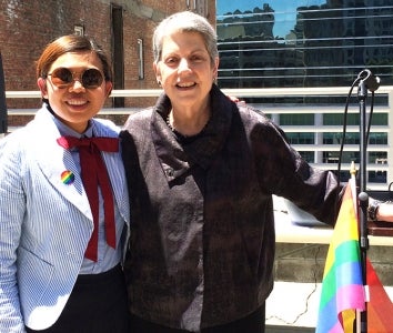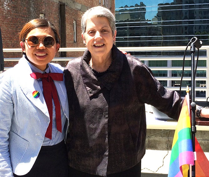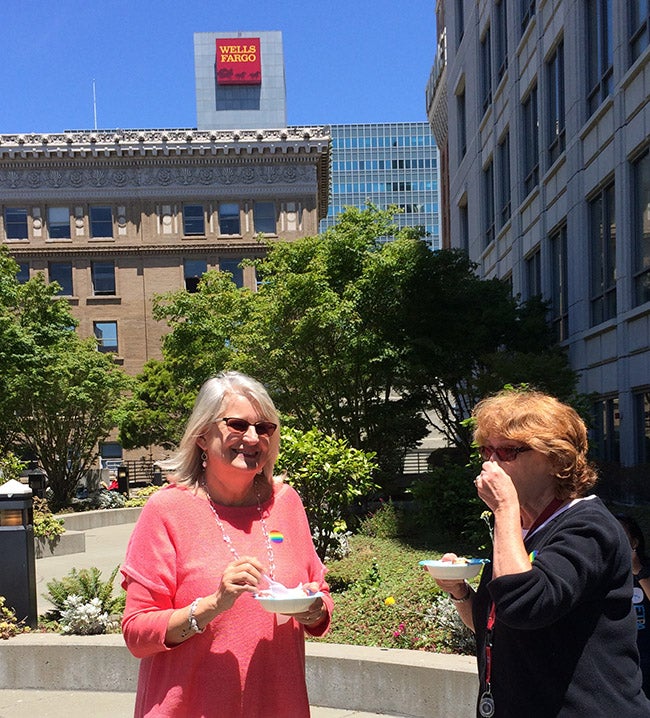 With those words, President Napolitano added sprinkles of optimism to the 7th annual UCOP Pride Ice Cream Social, which she celebrated with a large crowd of OP colleagues on June 2. While acknowledging that “the political winds have shifted” since last year’s social, she affirmed that at both OP and UC, “our commitment to a diverse and inclusive community has not wavered.”