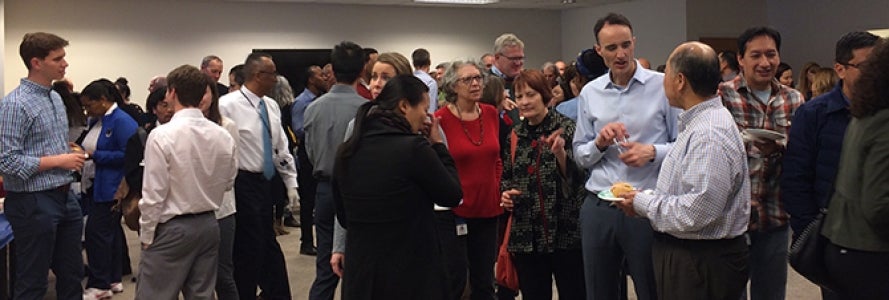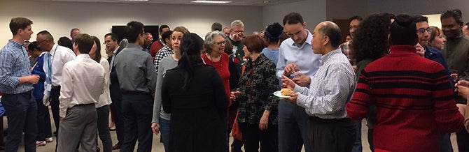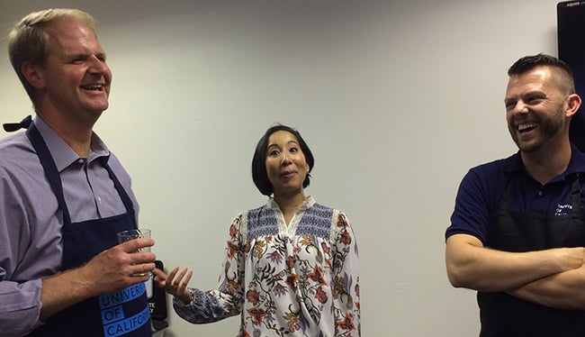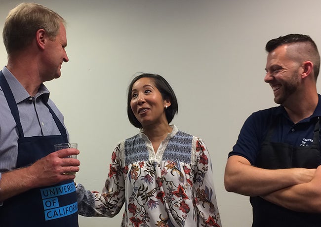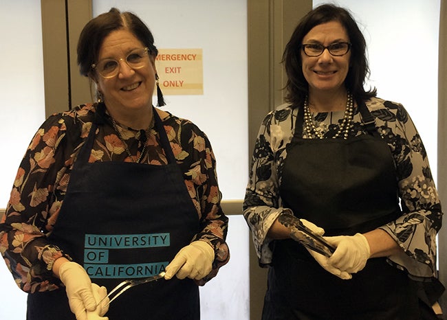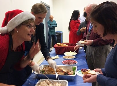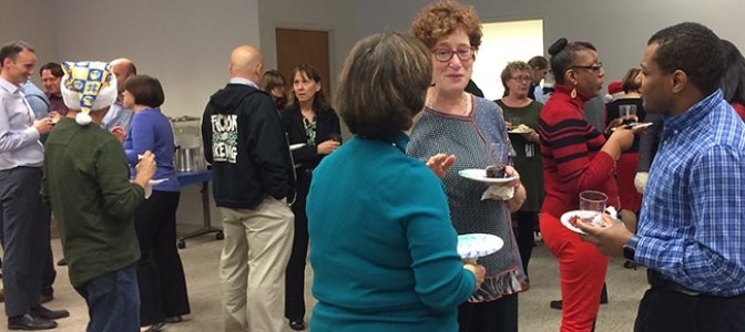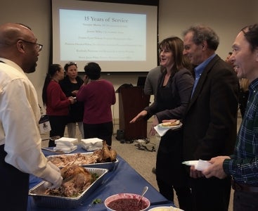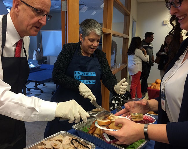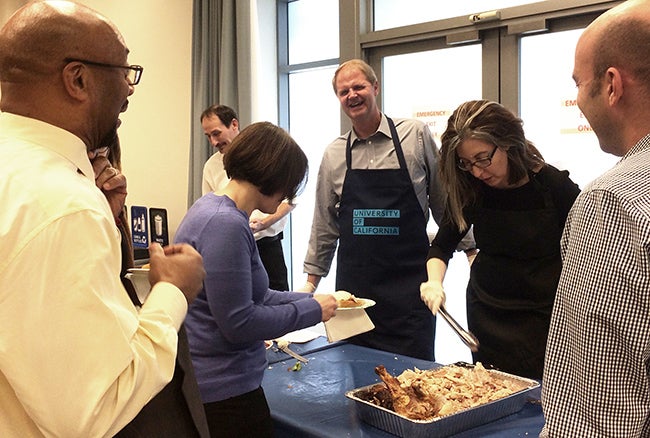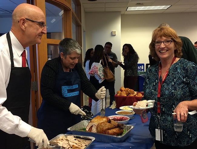 Thanks to the generosity of UCOP management staff in hosting the celebration with their personal funds, everyone enjoyed delicious turkey hand-carved by President Napolitano and other UCOP leaders, as well as hors d’oeuvres and tantalizing sweets. Staff mixed and mingled on three different floors of the building, catching up with colleagues while enjoying the treats provided.
