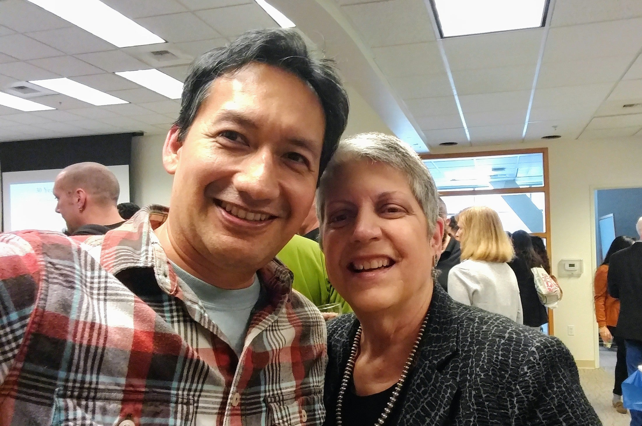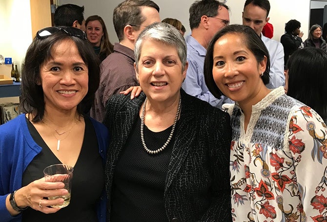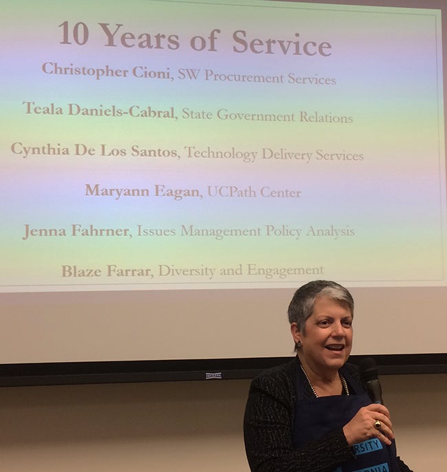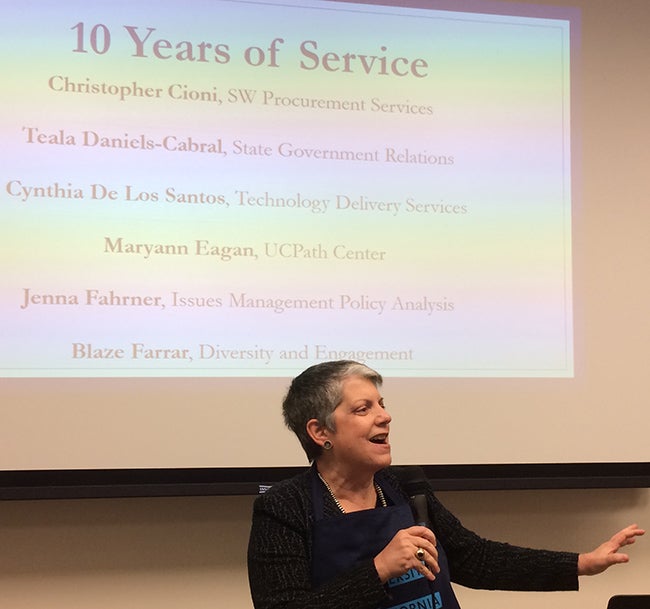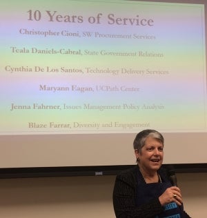 President Napolitano took the microphone briefly to salute all UCOP staff for their hard work. “This is an amazing institution,” she said. “And it takes a lot of people working together to make it so.” Her appreciation was underlined by the slideshow projected behind her which listed the names of UCOP employees being honored for their years of service. “I hope you are as energized by our mission as I am,” she concluded before wishing everyone a great 2018.