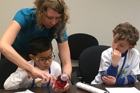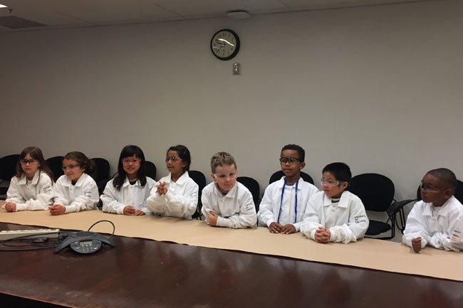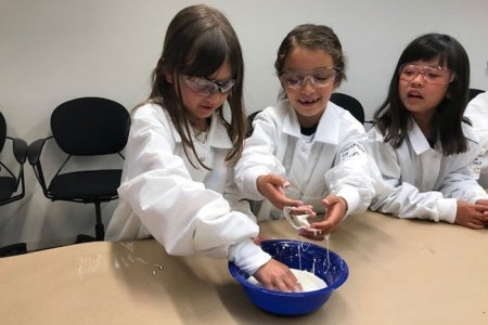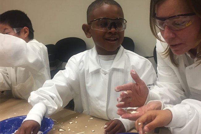Elsewhere, a room full of first graders were introduced to UC’s Lab Safety protocol, donning UC lab coats and protective goggles as they created “non-Newtonian” fluid, a liquid you can turn into a solid by tapping on it. The children mixed corn starch and water together, which acts like a liquid when stirred slowly but becomes hard when you tap it with your finger. The session was full of a lot of “eewww, it’s gross, it’s so slimy” and “it melts!”