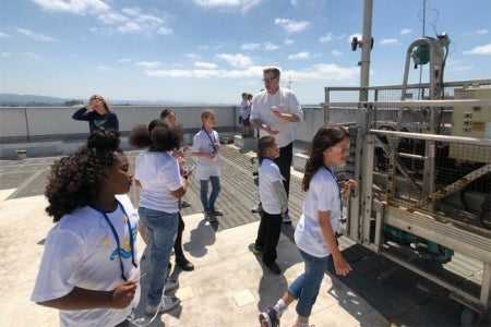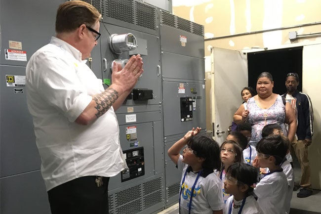 Chief Building Engineer Matt Leet led groups of children on a tour of the Franklin Building, from its rooftop to its basement and to floors in between, including the president’s office.