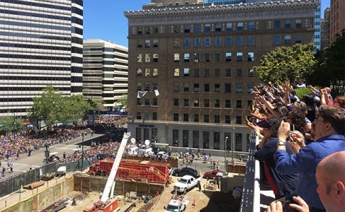 UCOP staff cheered from the sidewalks, the Franklin fifth floor patio, office windows — wherever they could get a glimpse of the floats and double-decker buses ferrying their favorite Warriors players down the parade route. Click through our photo slideshow if you missed the parade, couldn’t get a good view or just want to relive the confetti-filled festivities.
