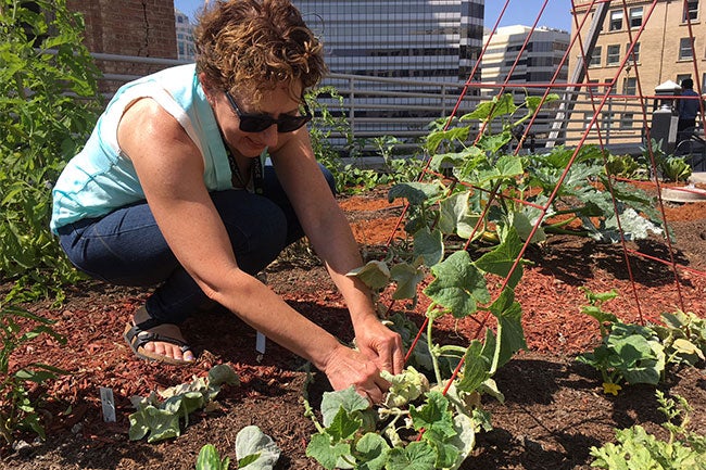 “We want people to come enjoy it,” said Stefani Leto, a policy analyst with the Office of the Secretary of the Regents, as she pruned a Thai basil plant in the garden. “They can take a little bit: some mint for their tea, some tomatoes, some peppers. If there’s any doubt if it’s ripe, they can ask me.”