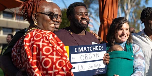 Joined by his family, friends, church members and pastor, UC San Diego medical student Emmanuel Elijah celebrates his match in obstetrics and gynecology at UC San Diego — his first choice.