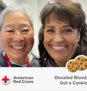 Longtime UCOP blood donors Jan Kehoe (left), a retiree, and Trish Dolan, senior design analyst, take a selfie after participating in the July 22, 2025, Red Cross Blood Drive in Oakland.