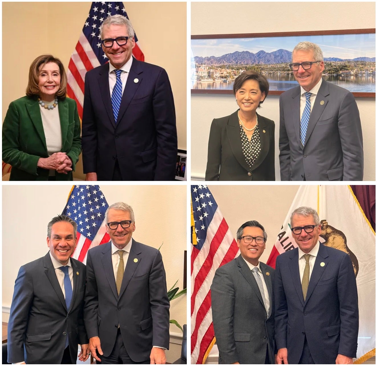 President Milliken visits with Speaker Emerita Nancy Pelosi (CA-11, top left), Rep. Young Kim (CA-40, top right), Rep. Pete Aguilar (CA-33, bottom left) and Rep. Vince Fong (CA-20, bottom right).