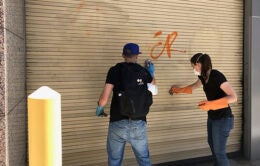 Local volunteers removed graffiti from the building following the weekend’s protests in downtown Oakland.